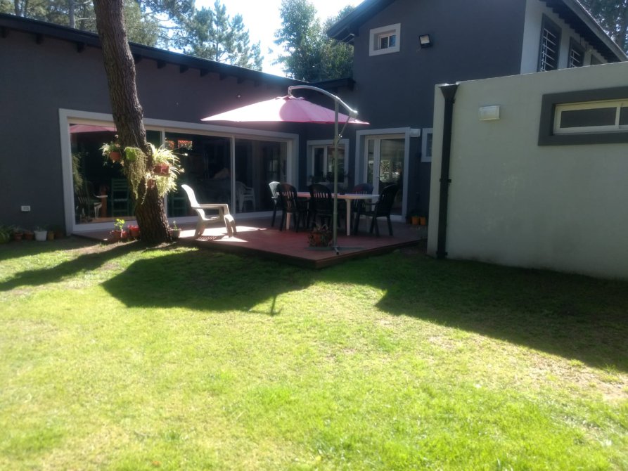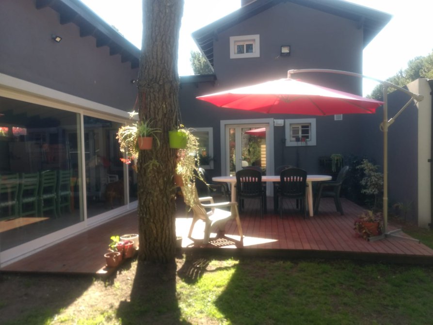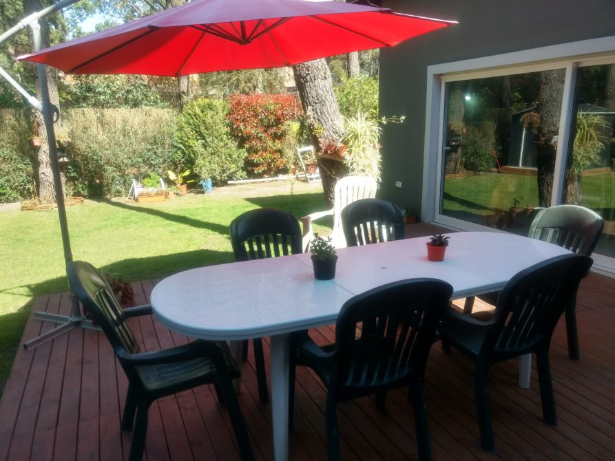 Deck con mesa y sillas plásticas para 6 personas de exterior. Jardín con riego automático.