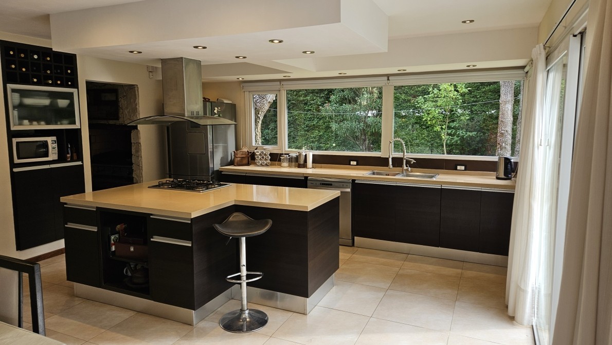 Excelente propiedad, ideal por sus comodidades, las escaleras son todas con barandas de aluminio con vidrio) Posee una muy moderna cocina c/ un ventanal con vista a la laguna artificial de la reserva, en la misma hay una isla con su campana respectiva, donde se encuentra el anafe con una hornalla central para cocinar con la paellera o el Wock, posee un módulo que es Heladera y otro modulo igual que es todo frezzer, y muy bien equipada la cocina, en el lavadero pose varios módulos incluida tabla de planchar, con lavarropa automático, también posee un horno Pizzero de fundición, y parrilla interna a Gas también posee un módulo de Bífera,
