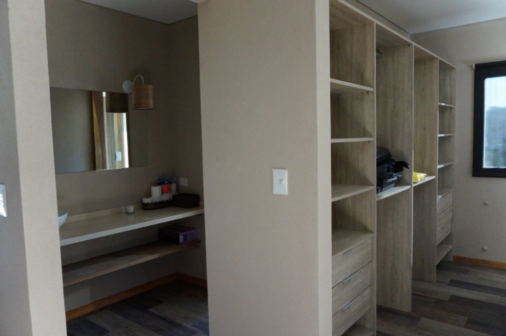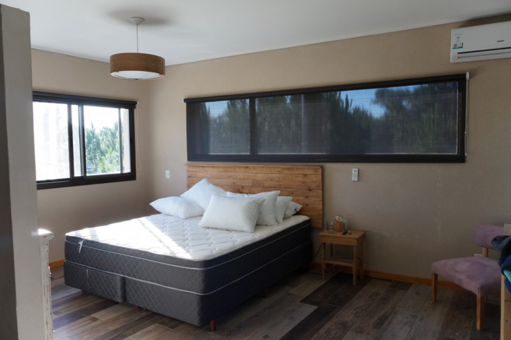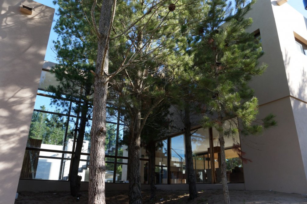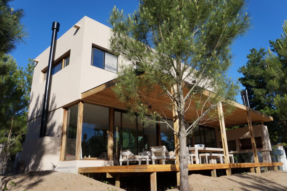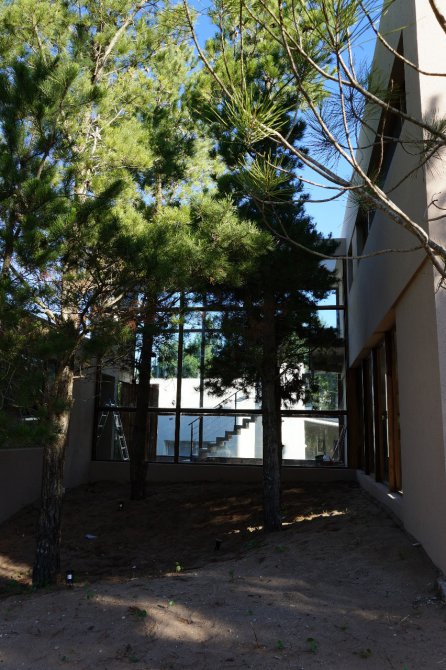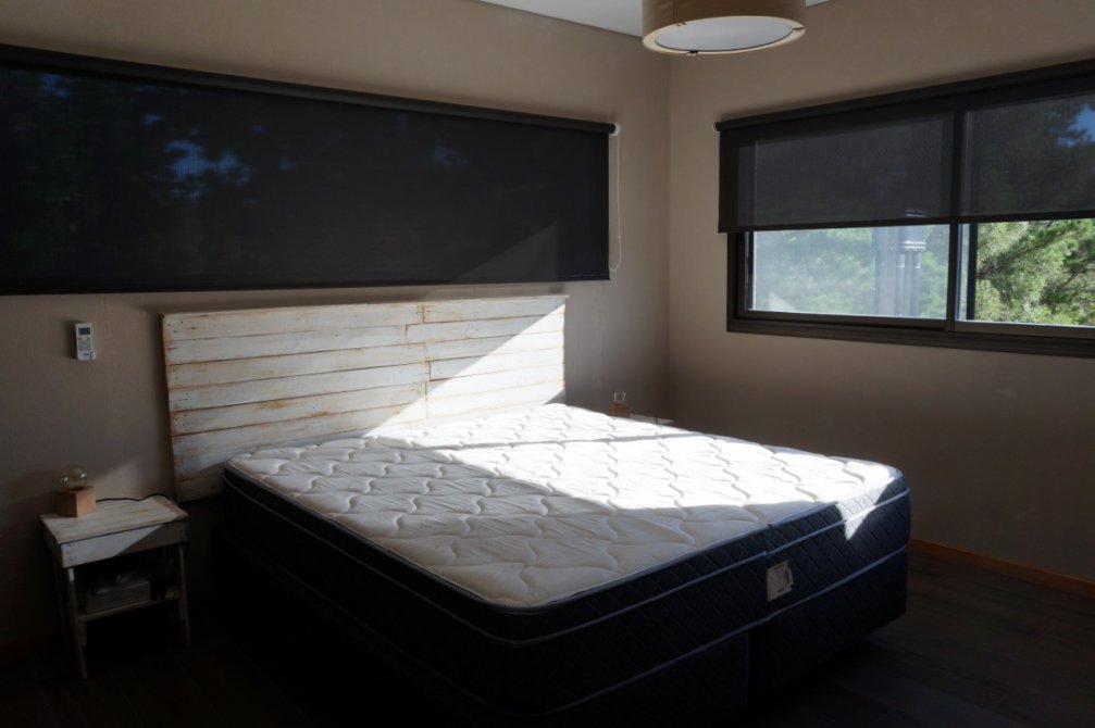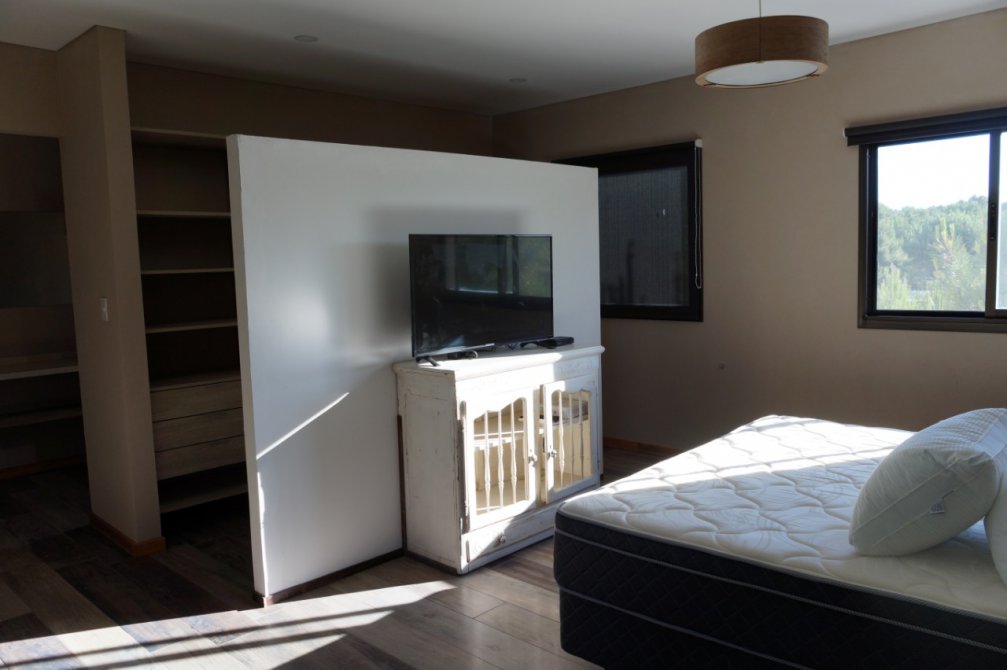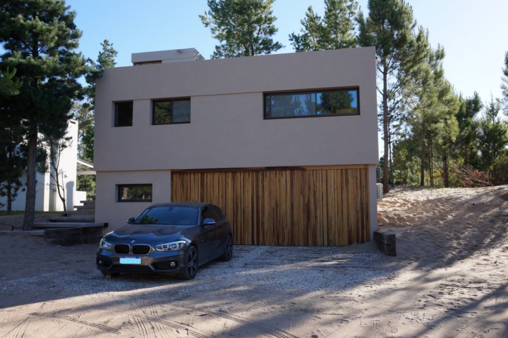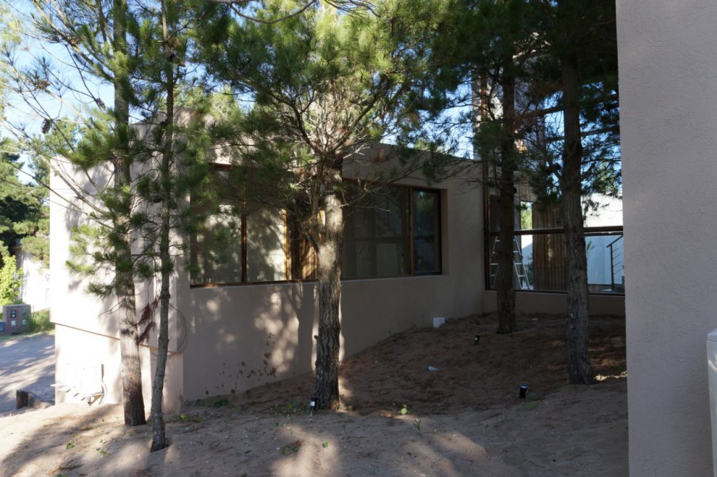Casa moderna, a estrenar, 5 dormitorios en total: 2 en suite, uno con vestidor. Otros 2 dormitorios comparten 1 baño y otro cuarto de servicio con baño (total 5 dormitorios con 4 baños completos). Cochera doble, en la cual se encuentra el lavadero. Cocina, comedor, living integrados, vista a amplia galería con parrilla. La casa envuelve un jardín interior a través de amplios ventanales. Rodeada de pinos y plantas de la región.